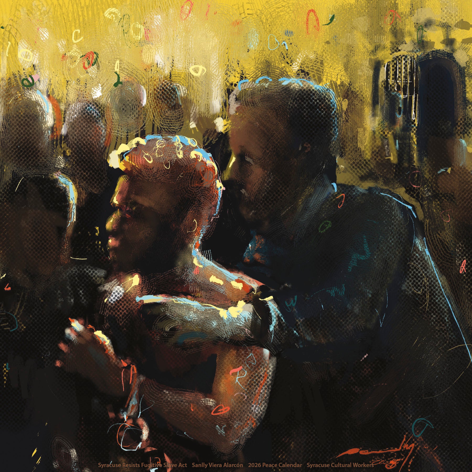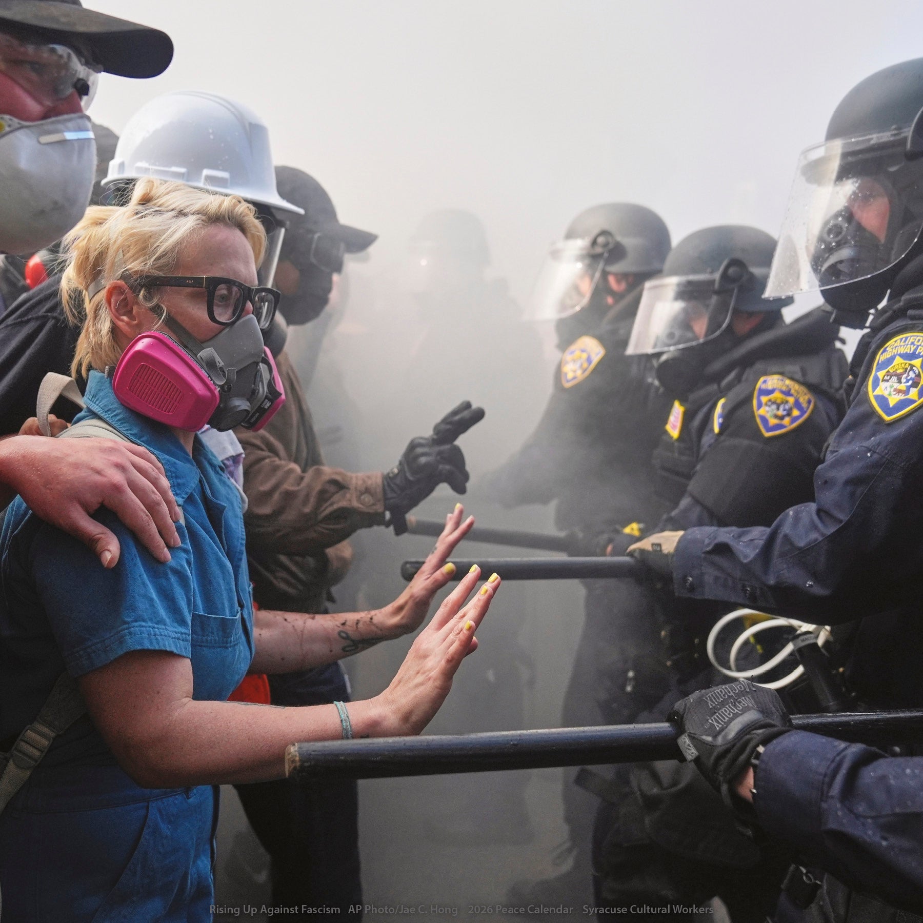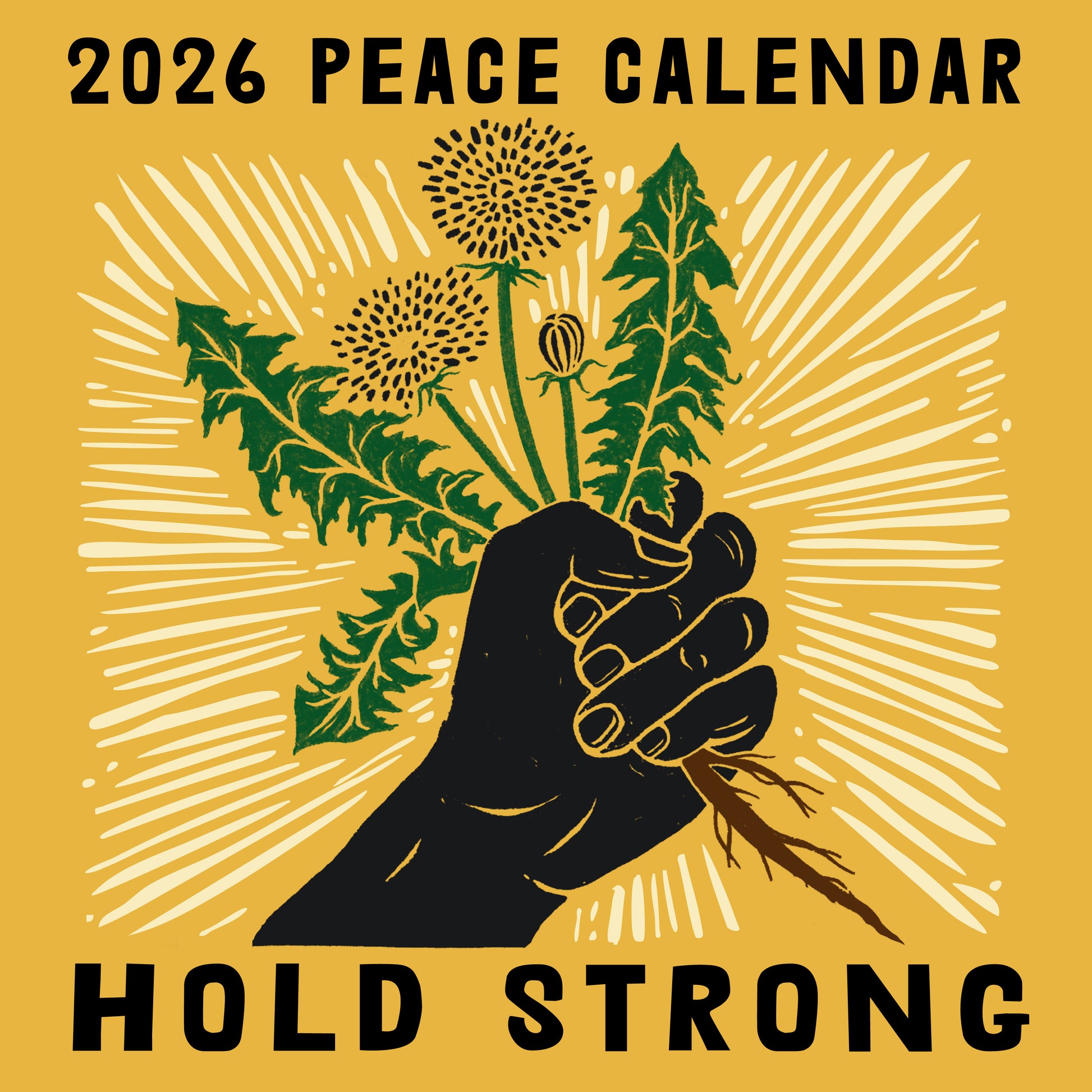 A full year of dynamic, uplfting artwork to sustain us through challenging times. The diverse array of media and styles – murals, painting, illustration, photography, and mixed media – will enrich your days throughout 2026. Dio Cramer's powerful cover art calls us to resist together to Hold Strong to our values.