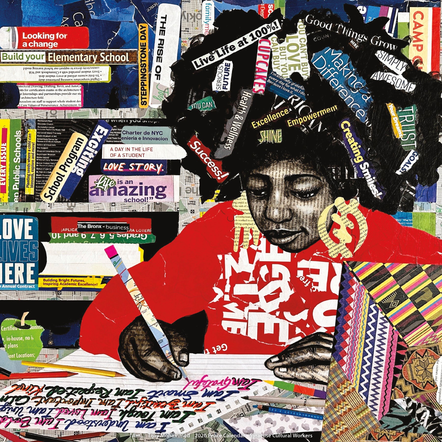 Public education (50 million students in the US) is key to brighter futures for each child and our society. Public schools provide not only general curriculum to help children understand the world around them, but opportunities for kids from diverse backgrounds to come together, learn, share experiences and build relationships. Effective public schools can also reduce inequality by providing children from underprivileged backgrounds with education, skills and connections to help them break the cycle of poverty. Ghanaian-born artist Tijay Mohammed includes Ghanaian symbols to combine traditional wisdom with academic knowledge.