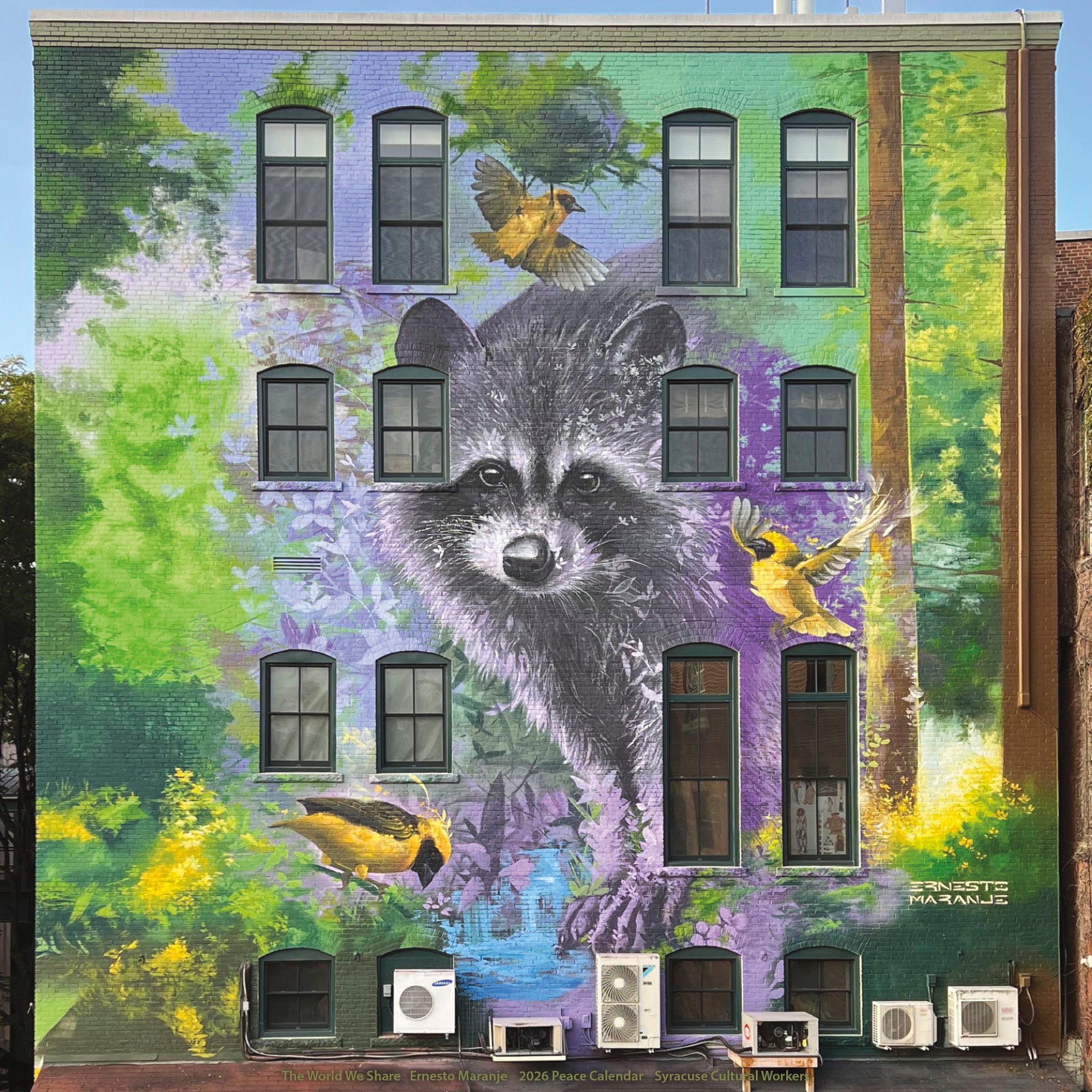 Ernesto Maranje’s 2022 mural at Thornes Market in Northampton, MA, features weaver birds, known for their nest-building skill, and a raccoon, titled Azeban, after a “local told Ernesto that Azeban is a raccoon trickster in folklore for the Indigenous Algonquian people of the area”. The Indigenous cultures of the Connecticut River valley of western Massachusetts believed that all creatures were equal. Animals were different from people, but not necessarily subordinate to them. Wildlife should be left to live their lives the way that was natural for them.