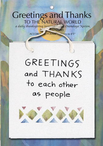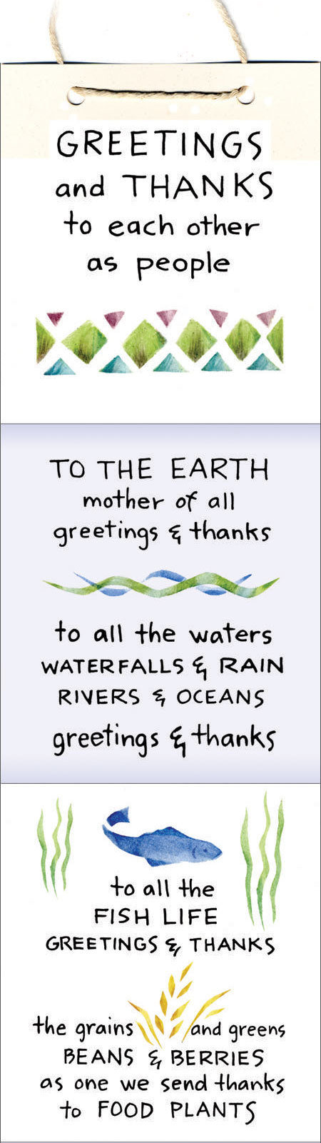In eleven hand-lettered and watercolor-illustrated panels, Greetings and Thanks honors the universal message of gratitude and thanksgiving. It is long and narrow when hung on your wall (it comes with hanging string!) or small and handy for prayers and meditations when kept on your night stand, altar, or near your dining table. Inspired by the Thanksgiving Address of the Haudenosaunee, an oral tradition used at gatherings. Poster printed on 100% postconsumer waste stock, dioxin free, not chlorine bleached. Biodegradable cellophane package.