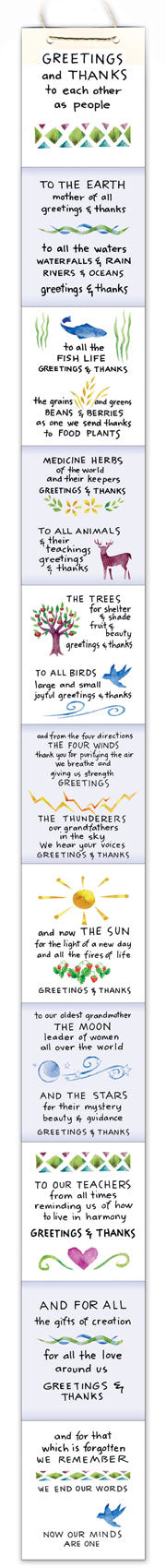 Both a visual and spiritual reminder, the message from the Haudenosaunee can be used by all people all over the world. I have used it many times for gifts, and to spread the word of thankfulness and appreciation to all Creation. -Jeanne Shenandoah (Eel Clan, Onondaga)