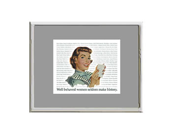 A 1950's retro "lady" is surrounded by 104 women (or groups) who have challenged the status quo - and made big differences in our lives. From Rachel Carson to Angela Davis to Ani Difranco to Amy Goodman to Madonna to Gloria Steinem to Alice Walker, it's an honored list of hell-raisers. And don't be fooled by this lady's appearance - check out her "to-do" list!
