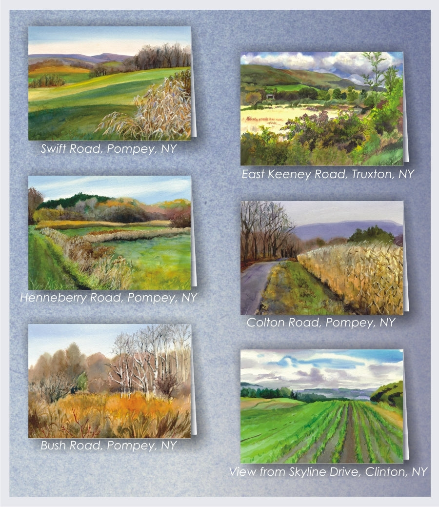 An assortment of 6 notecards are packaged by theme in Gift Folios by local Central New York artist Lucie Wellner.