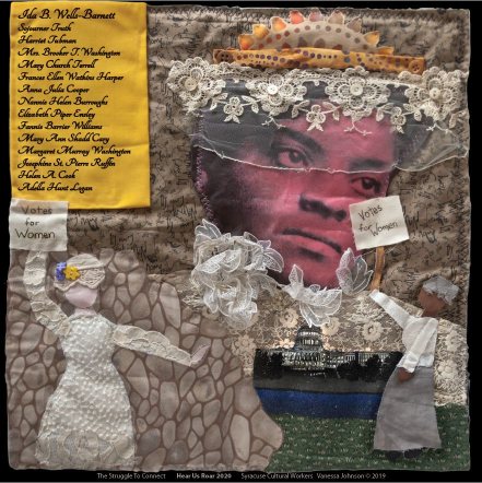 Art: Center - digital graphic by SCW © 2019. Historical images clockwise from top left: Woman Suffrage Convention! ad by NYS Woman’s Suffrage Association, Library of Congress (LoC); Women’s Suffrage March and Mass Meeting poster printed by J. Weiner LTD., London, UK, designed by Watts, C. M. ca. 1907-1918, Harvard Library; Sojourner Truth lecture poster, Bentley Historical Library; poster designed by SCW from article in the Anti-Slavery Bugle, April 13, 1850, LoC; Scrapbooks, On the Woman’s Rights Convention, prepared by Elizabeth Cady Stanton in 1848, LoC; Men! Give women votes to protect the children poster for the International Woman Suffrage Alliance designed by Willy Pogány in 1914, New York Public Library.
