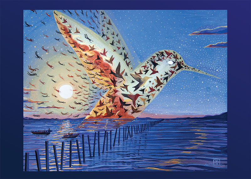 More than a hundred different species and colors of hummingbirds have been migrating from Central America across the Sonoran Desert and back for thousands of years. The migratory journey of the hummingbird is an ancient cycle that outlives every border drawn by nation-states. Similar to the hummingbirds, the immigration of Black and Brown people is driven by the radical imagination of a future free of borders, incarceration and white supremacy. As migrants and refugees soar and sail on their ships across the border, their bodies transform into hummingbirds. The friction of their solidarity forms a monumental hummingbird - the migrant justice movement - a living community that breathes, soars and imagines together. Our heart is beating 300 times a minute.
