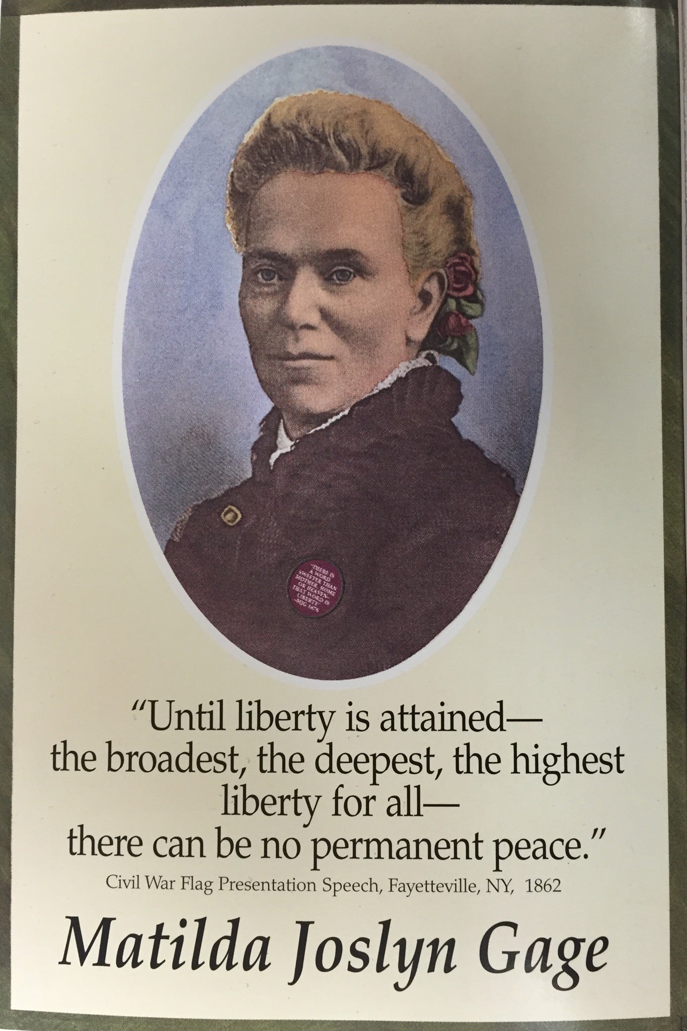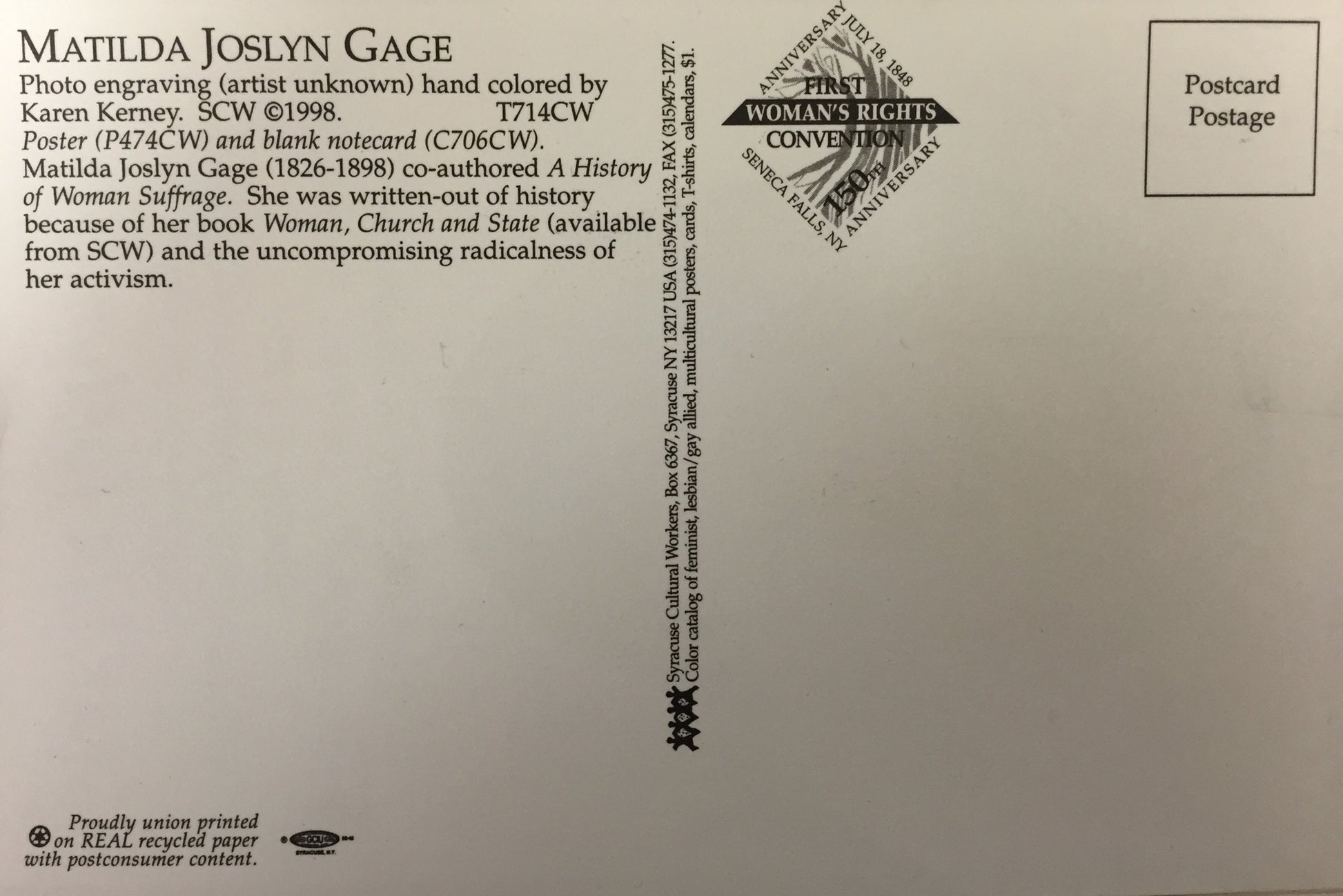 Matilda Joslyn Gage (1826-1898) co-authored A History of Woman Suffrage. She was written-out of history because her book Woman, Church and State and the uncompromising radicalness of her activism. Historian and activist Sally Roesch Wagner worked for a number of decades to restore Gage's place in feminist and women's suffrage history.