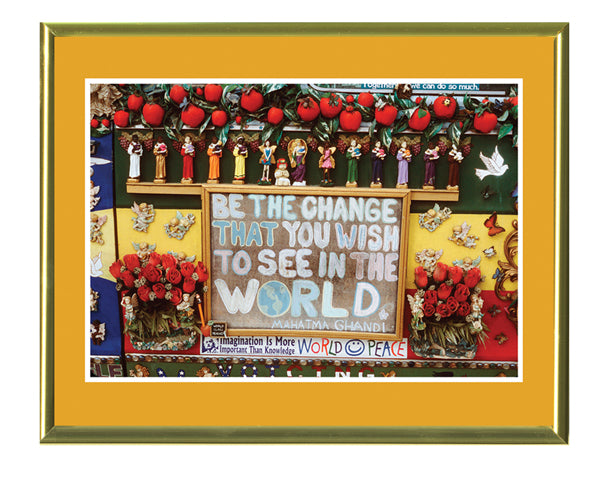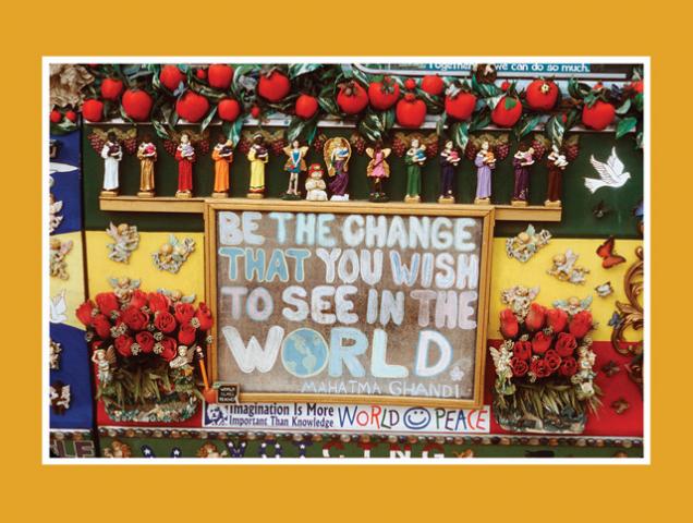 Anna Pomaska ©2003. SCW©2006 Detail of a beautifully decorated "peace van" crafted by a member of the Rainbow Family, seen near Pacific Grove, CA. Includes a misspelling of Gandhi's name!