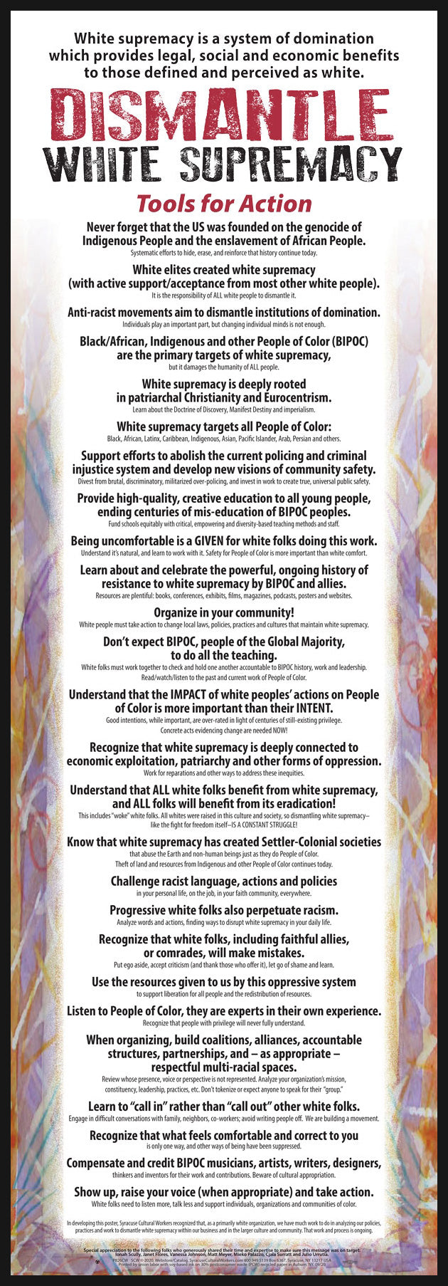 In developing this poster, Syracuse Cultural Workers recognized that as a primarily white organization, we have much work to do in analyzing our policies, practices and work to dismantle white supremacy within our business and in the larger culture and community. That work and process is ongoing.