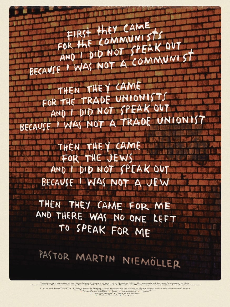 Martin Niemoller, imprisoned by the Nazis, used this quote in post-World War II speeches to urge solidarity against all forms of repression. The US Holocaust Museum in Washington, DC features the quote and sells the poster. Various colored triangles the Nazis used to identify “dangerous persons” are explained beneath the brick wall. While Jews were the primary target of the Nazis, many others were targeted for violence as well.